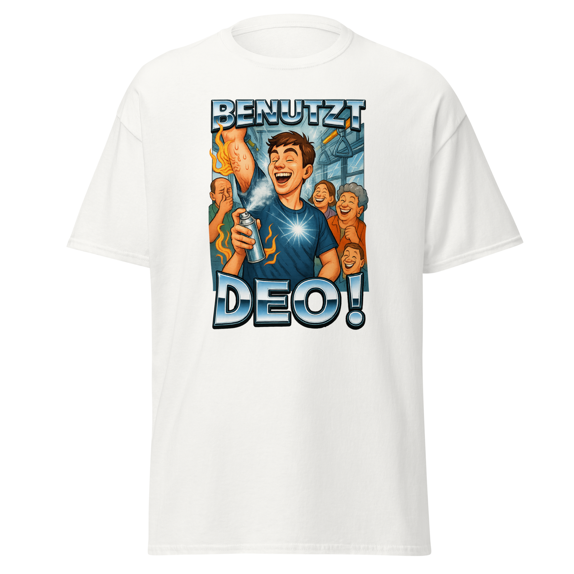 Das „Benutzt Deo!“-T-Shirt ist die humorvolle Antwort auf das allseits bekannte Problem in Bus & Bahn: stickige Luft und Mitfahrer, die das Deo-Regal seit Jahren nicht mehr gesehen haben. Mit dem Motiv eines fröhlichen Typen, der Deo versprüht, während umstehende Fahrgäste erleichtert lachen, bringt dieses Shirt die Wahrheit auf den Punkt: Öffis wären so viel angenehmer, wenn alle einfach mal Deo benutzen würden!